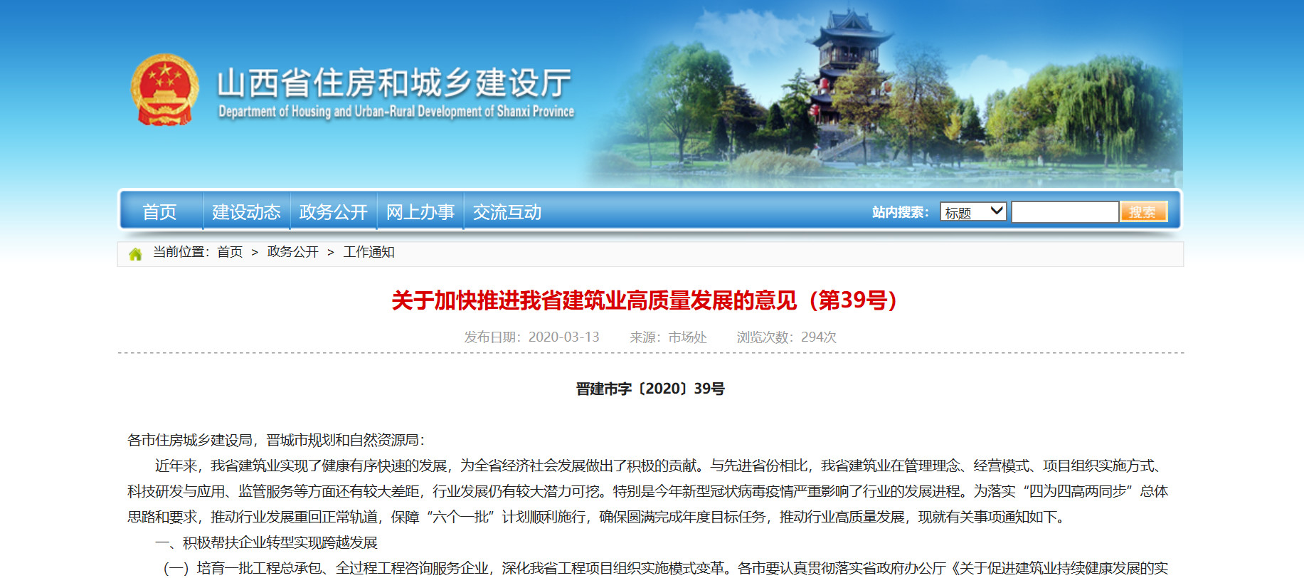 2020年3月13日,山西省住房和城鄉(xiāng)建設(shè)廳發(fā)布了《關(guān)于加快推進我省建筑業(yè)高質(zhì)量發(fā)展的意見 》晉建市字〔2020〕39號,文中強調(diào):
