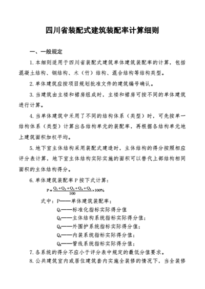 要點:《四川省裝配式建筑裝配率計算細(xì)則(試行)》實施以來,對全省裝配式建筑裝配率計算起到了積極的指導(dǎo)和規(guī)范作用。為進(jìn)一步推動我省裝配式建筑的發(fā)展,規(guī)范裝配率計算,提升標(biāo)準(zhǔn)化建設(shè)水平,推進(jìn)系統(tǒng)集成技術(shù)發(fā)展應(yīng)用,我廳組織相關(guān)單位進(jìn)行了修訂,并經(jīng)專家審查通過,形成了《四川省裝配式建筑裝配率計算細(xì)則》,現(xiàn)予印發(fā),自 2020 年 10 月 1 日起實施。